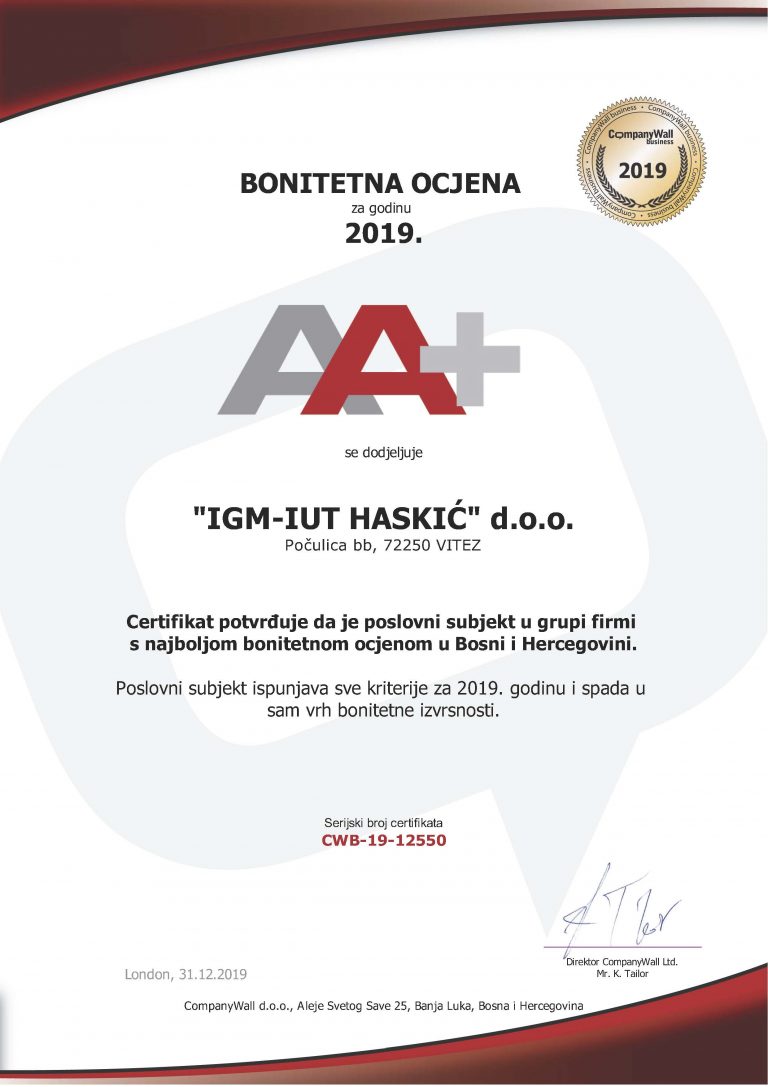 IGM IUT HASKIĆ d.o.o. Vitez se nalazi među najkonkurentnijim bosanskohercegovačkim firmama, a rezultati našeg rada u prethodnoj godini rezultirali su bonitetnim rejtingom AA+ 2019 godine.